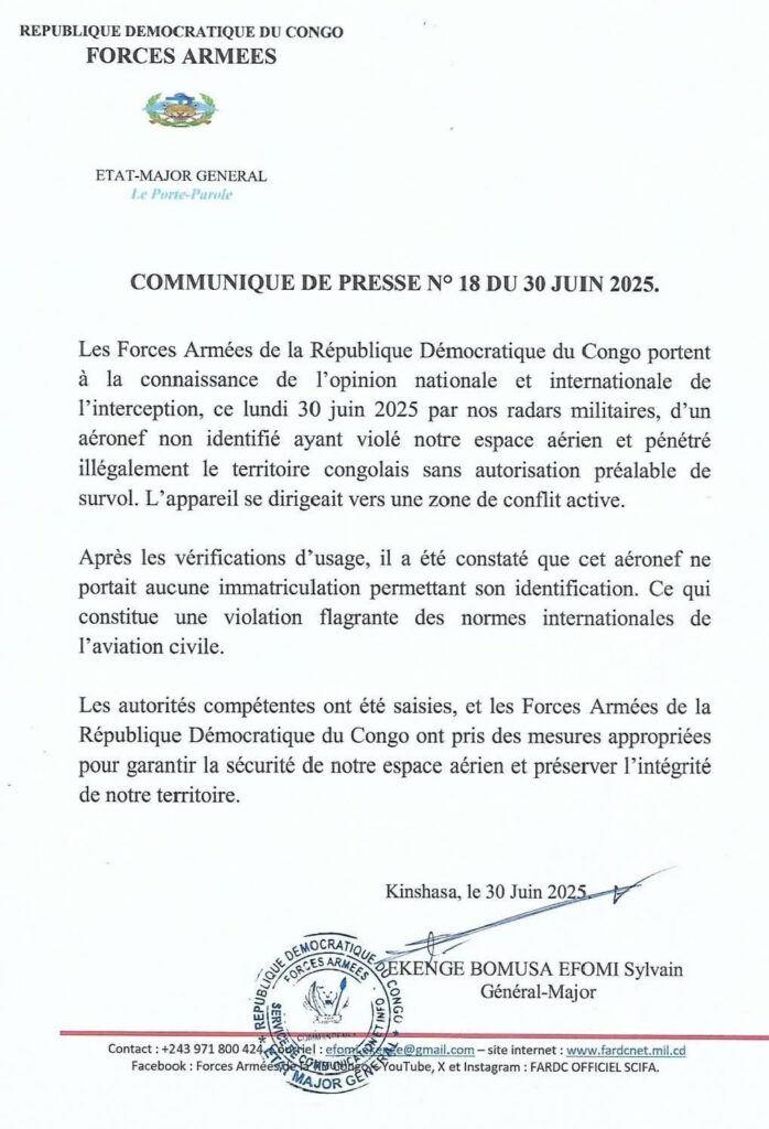 Kinshasa, 30 juin 2025 – Les Forces Armées de la République Démocratique du Congo (FARDC) ont annoncé, ce lundi 30 juin 2025, l’interception d’un aéronef non identifié ayant pénétré illégalement dans l’espace aérien national. Selon un communiqué de presse émis par l’État-Major Général, l’appareil a été détecté par les radars militaires alors qu’il se dirigeait vers une zone de conflit active, sans autorisation préalable de survol.