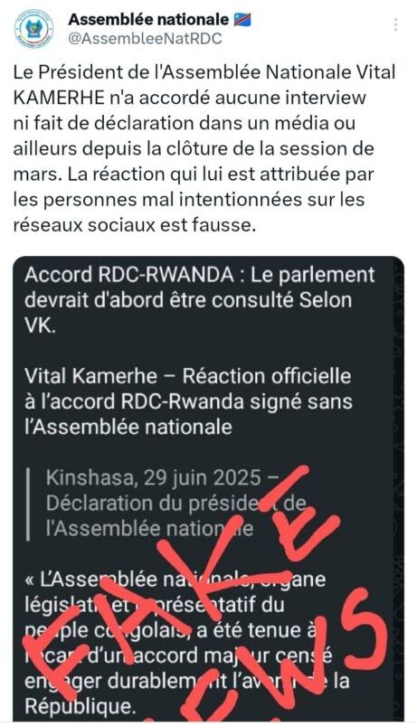 La présidence de l’Assemblée nationale a formellement démenti ce [jour] une déclaration attribuée au président de l’institution, Vital Kamerhe, qui circulait abondamment sur les réseaux sociaux ces derniers jours. Selon une note officielle du bureau du parlement, ces propos seraient l’œuvre de « personnes mal intentionnées ».